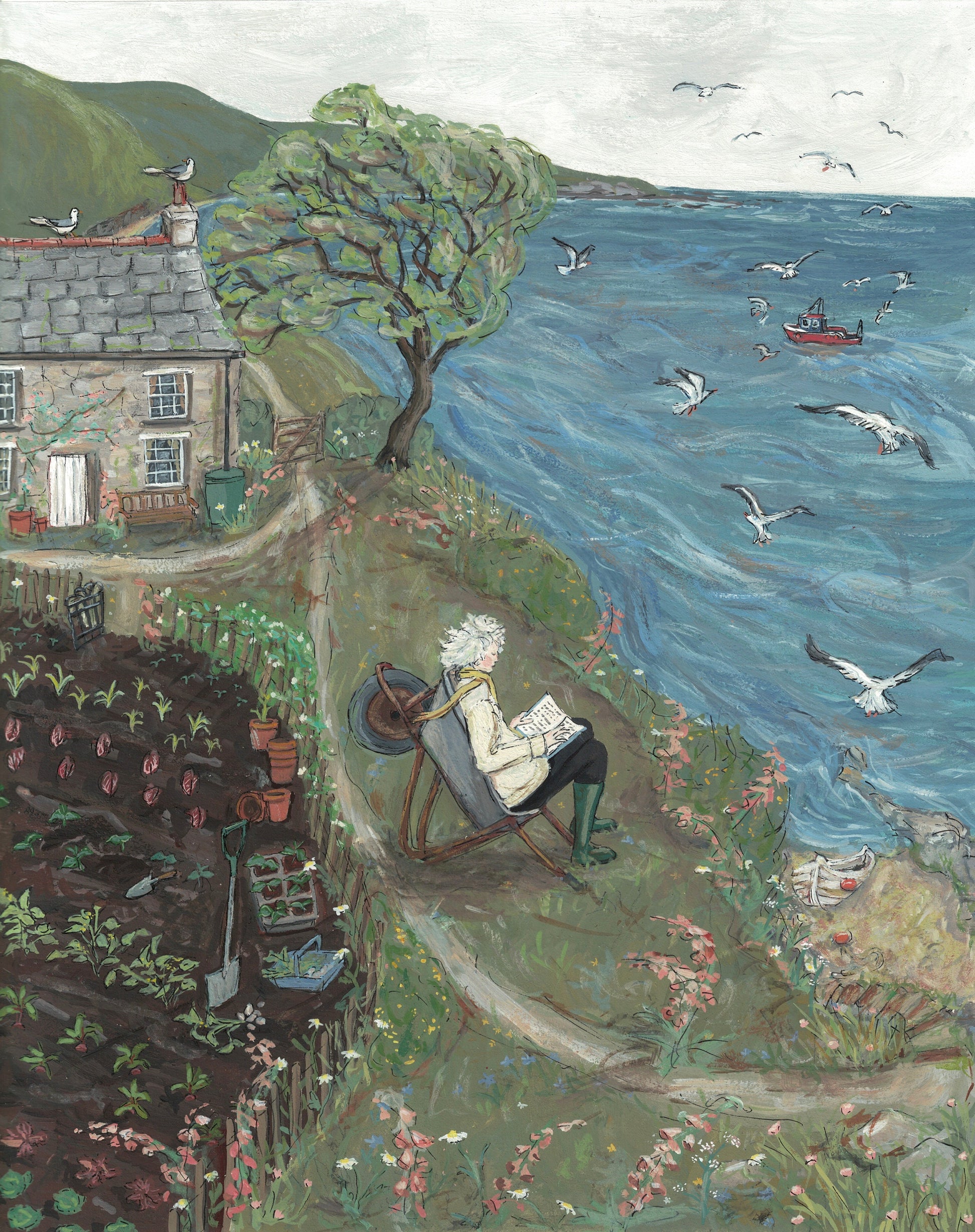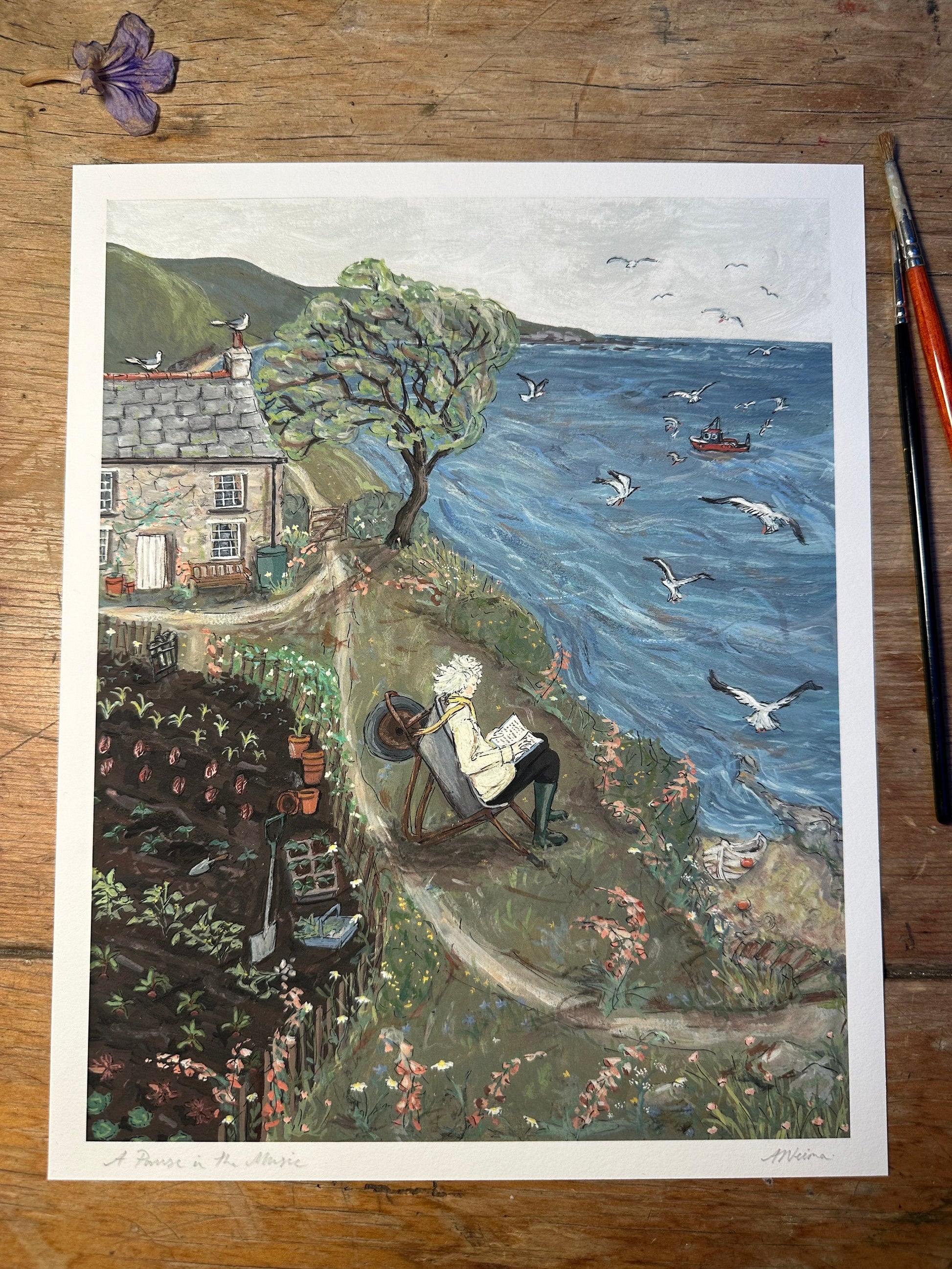 This giclée print is a reproduction of my gouache painting 'A Pause in the Music’. A celebration of gardening and nature, the peace that can come with slowing down, reading, the sea, and above all Rowena Cade - an extraordinary woman who (among other feats) transformed her rocky, clifftop Cornish garden into the open-air Minack Theatre – and took breaks from her labours sitting in her wheelbarrow with a book . . . A very desirable way to spend old age I think!