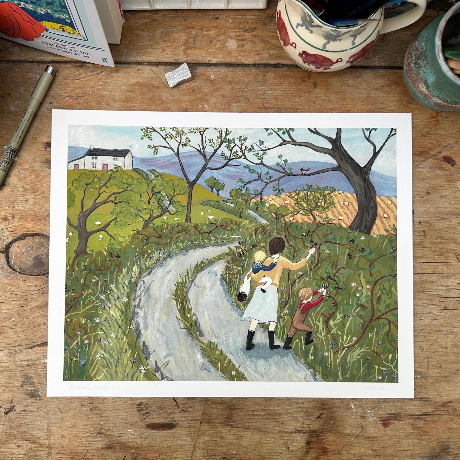 This giclée print is a reproduction of my gouache painting 'Blackberry Picking’. A celebration of slow-living and foraging, nature and blackberries, and the peaceful moments in the chaos of motherhood – with lots of warm and calm greens and ochre yellows.
