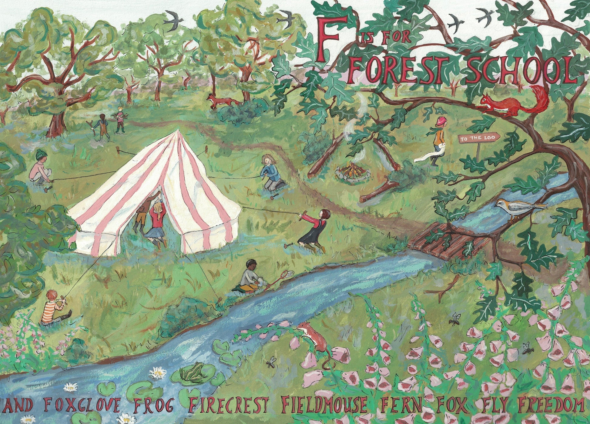 This giclée print is a reproduction of my gouache painting 'F is for Forest School’. A celebration of nature, friendship, slow living, the great outdoors and children’s wonderful imaginations – with lots of warm and glowing greens and pinks.