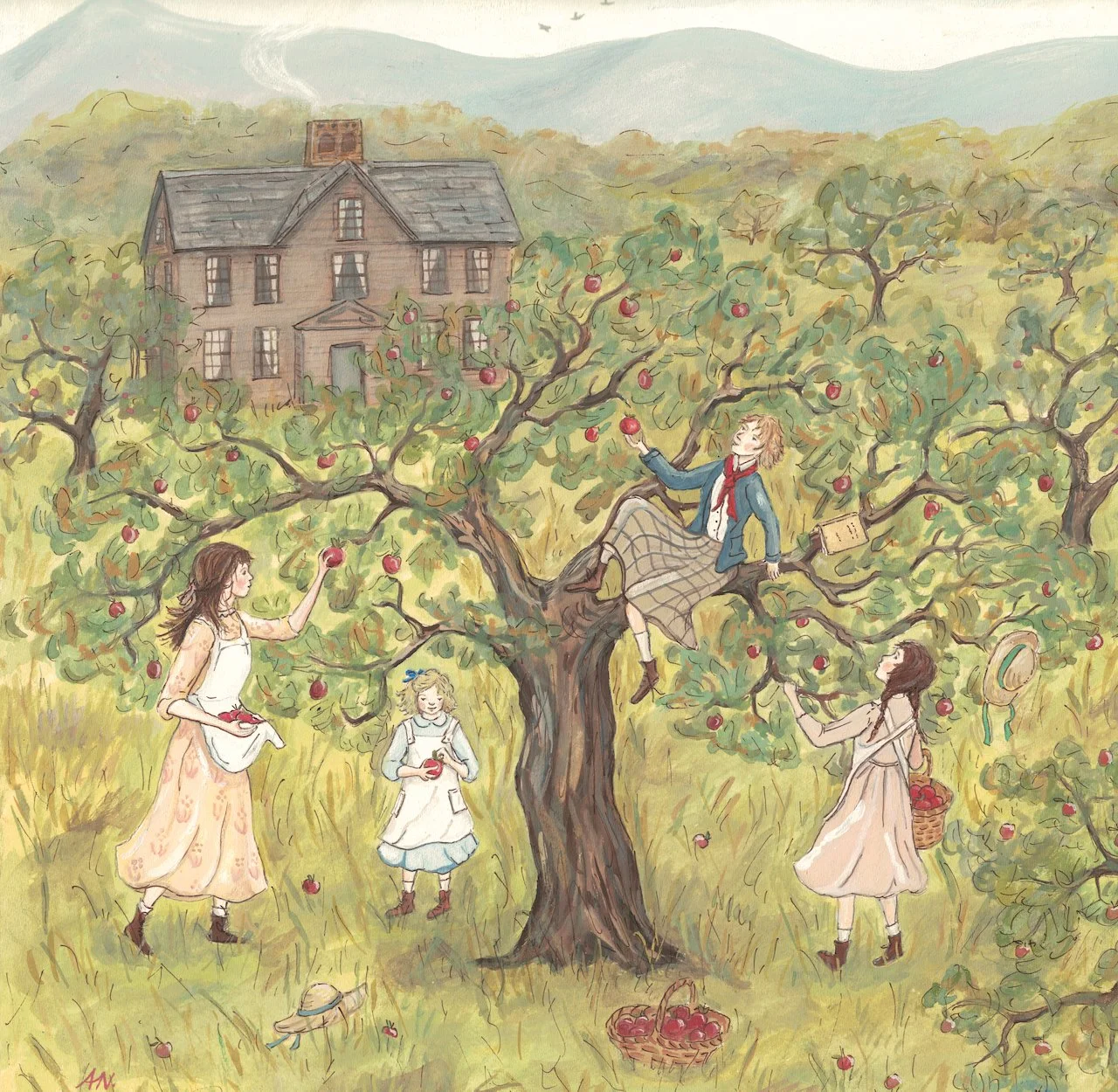 Initially these Little-Women-esque siblings were going to be ice-skating, but I was sidetracked by thinking about apples. The Marches' home in Little Women is inspired by Orchard House, where Louisa May Alcott lived from the age of 26 with her parents and sisters. And the house was named after the many surrounding apples trees by Louisa May Alcott’s father, Amos Bronson, a wonderfully idealistic teacher who believed that all morality comes from within. So there are all those apples – and I also love Louisa's description of her hero Jo retreating to her garret with six apples and a novel to weep over.
